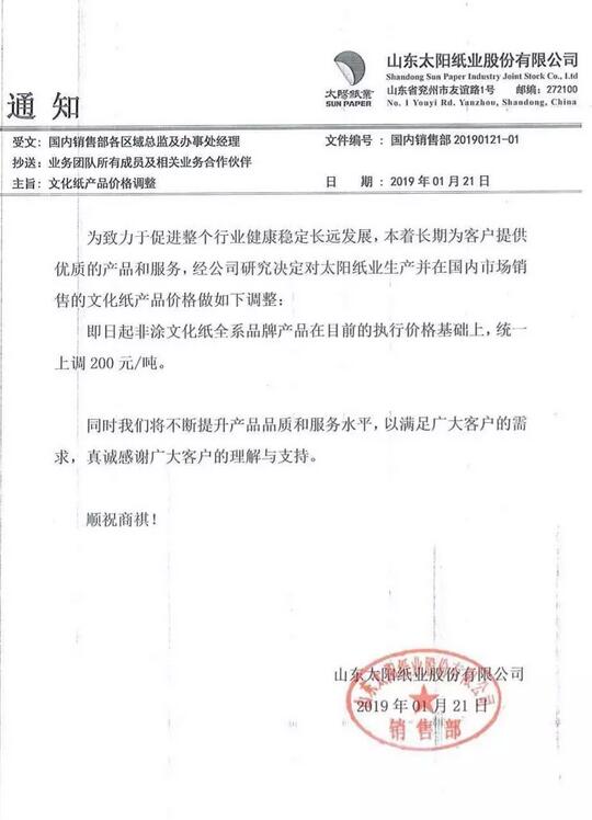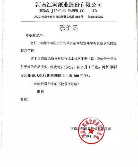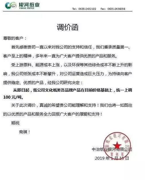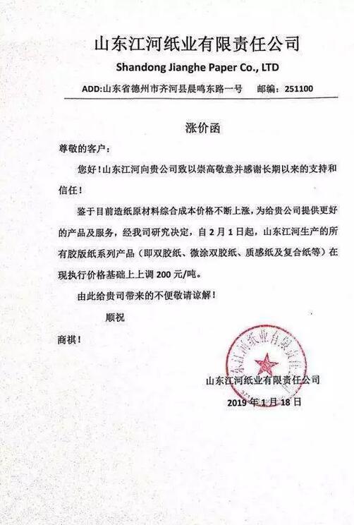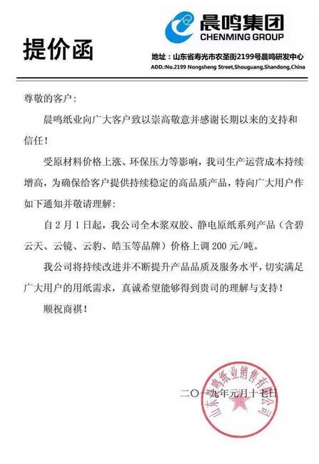 1月19日,闊葉漿價出現跳漲異動,1月中下旬,市場依舊平淡,但漲價函頻現,白卡、包裝紙和文化紙市場均有漲價函出現,淡季啟動漲價,可以判斷行業對春節后的價格反彈行情有所期待,淡季喊漲預熱,節后尚看供求。