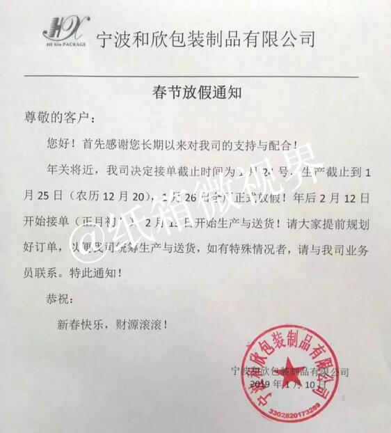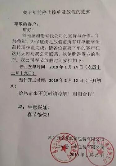 臺(tái)州市東奇包裝有限公司: 2019年1月19日(農(nóng)歷十二月十四)停止接單。 2019年2月15日(農(nóng)歷正月十一)正常開(kāi)工。