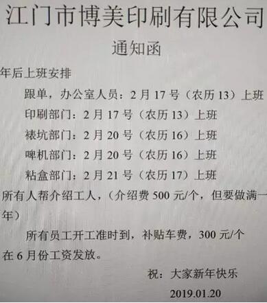 江門市博美印刷有限公司:年后上班安排:跟單、辦公室人員2月17日上班,印刷部門2月17日上班,裱坑部門2月20號(hào)上班,啤機(jī)部門2月20日上班,粘盒部門2月21日上班。