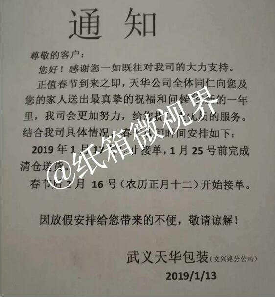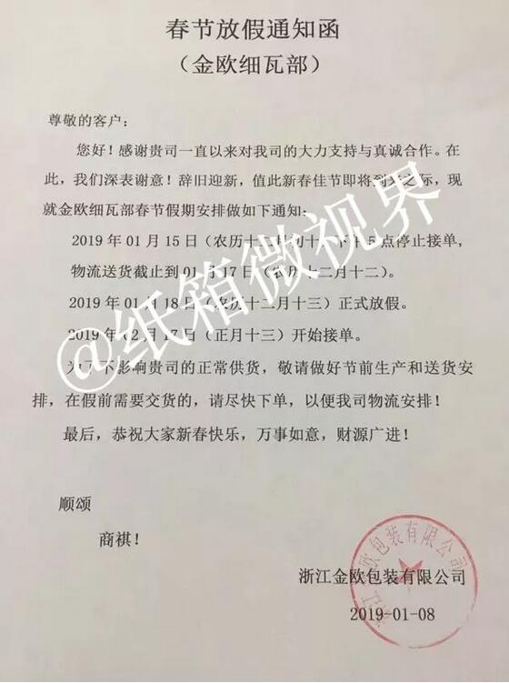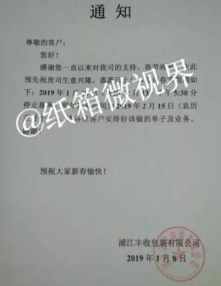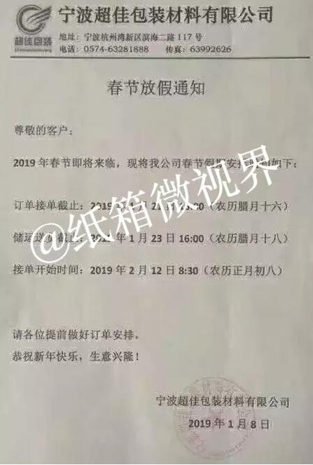導(dǎo)語(yǔ):截至1月22日,瓦小編了解到,至少已有12家紙板/紙箱廠發(fā)布春節(jié)放假通知。 上游漲漲漲,紙箱廠視而不見(jiàn)陸續(xù)放假 世界上最悲傷的事情就是明明說(shuō)好的一起復(fù)習(xí)到一點(diǎn)半,你卻偷偷報(bào)了補(bǔ)習(xí)班;而對(duì)于紙箱廠,更悲傷的卻是“當(dāng)我放假了,你卻漲價(jià)!薄翢o(wú)疑問(wèn),紙箱廠被上游硬擺著演了一出空城計(jì)。 然而,該配合你演出的我演視而不見(jiàn),當(dāng)原紙和紙板“漲漲漲”的時(shí)候,廢紙收購(gòu)價(jià)卻是“跌跌跌”。一周以來(lái)已經(jīng)有137家造紙廠對(duì)廢紙收購(gòu)價(jià)進(jìn)行了下調(diào)。這一切都是發(fā)生在紙箱廠陸續(xù)放假的最后一周。 截至1月22日,至少已有12家紙板/紙箱廠發(fā)布春節(jié)放假通知。 萍鄉(xiāng)市金象紙箱包裝有限公司:停止接單時(shí)間:2019年1月24日(農(nóng)歷十二月二十九)預(yù)計(jì)開(kāi)工時(shí)間:2019年2月12日。