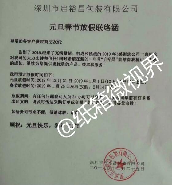 深圳市啟裕昌包裝有限公司:春節(jié)放假時(shí)間:2019年1月25日-2月14日。