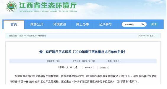 近日,江西省生態環境廳正式印發《2019年度江西省重點排污單位名錄》。