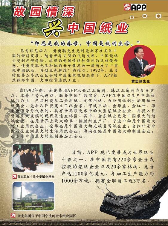 據(jù)印尼《好報》報道,金光集團(tuán)SinarMasGroup的創(chuàng)始人黃奕聰(EkaTjiptaWidjaya)于當(dāng)?shù)貢r間1月26日晚于7點43分鐘去世,享年98歲。其遺體暫厝于雅加達(dá)GatotSubroto醫(yī)院殯儀館。 黃奕聰是福建泉州人,7歲時到印度尼西亞,憑著華人吃苦耐勞的奮斗精神,艱苦打拼,白手起家,終于在上世紀(jì)60年代創(chuàng)立了金光集團(tuán)。集團(tuán)目前在全球有400多家法人公司,擁有員工20多萬名,總資產(chǎn)達(dá)200多億美元。 金光集團(tuán)主要由三大集團(tuán)組成,亞洲漿紙業(yè)股份有限公司(APP)、亞洲食品和不動產(chǎn)有限公司及印度尼西亞國際銀行。經(jīng)營紙漿和造紙、金融、農(nóng)業(yè)及食品加工業(yè)、房地產(chǎn)等四大核心產(chǎn)業(yè)。其中亞洲漿紙業(yè)股份有限公司是亞洲最大的造紙企業(yè),在全球共有29家制漿造紙企業(yè)。