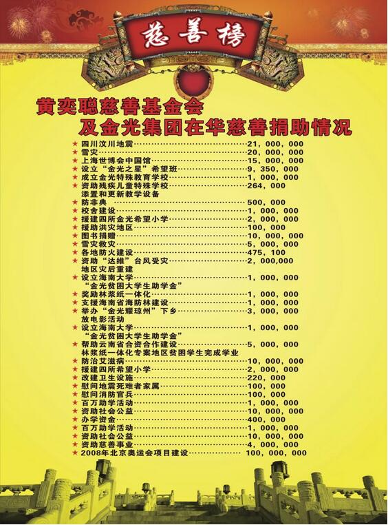 慈善公益 黃奕聰先生是一位愛鄉(xiāng)建鄉(xiāng)、造福桑梓的一代僑賢。他視家鄉(xiāng)發(fā)展為己任,傾一腔熱忱,為推動家鄉(xiāng)的改革開放和經(jīng)濟(jì)社會發(fā)展作出了重要貢獻(xiàn),捐建了小學(xué)、中學(xué)、大學(xué)、醫(yī)院、修路。如:奕聰小學(xué)、奕聰中學(xué)、金光隧道、奕聰科學(xué)樓……