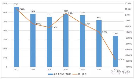 據(jù)resourcerecycling從中國海關(guān)總署得到的數(shù)據(jù),2018年,中國共進(jìn)口各類廢紙1705.5萬噸,低于2017年的2572萬噸,同比減少約33.8%,降幅創(chuàng)近年來之最,與2012年相比,國內(nèi)進(jìn)口廢紙量已經(jīng)下跌近一半。