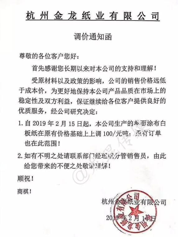 杭州金龍紙業(yè)有限公司:自2019年2月15日起,單面涂布白板紙在原有價格基礎(chǔ)上上調(diào)100元/噸,原有訂單也在此調(diào)價范圍內(nèi)。