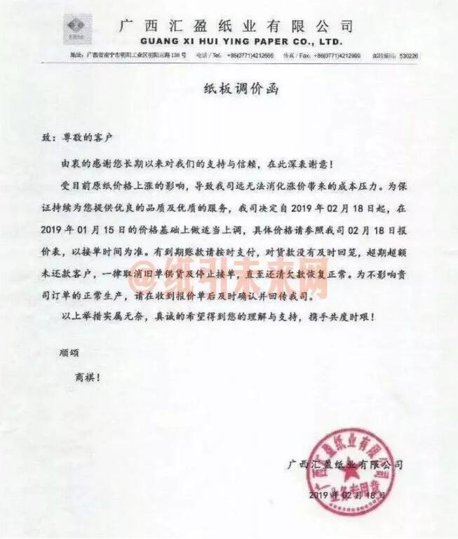 2月18日,廣西匯盈紙業有限公司發布漲價函: 2019年2月18日起,在2019年1月15日的價格基礎上做適當上調,具體價格請參照公司2月18日報價表,以接單時間為準。 有到期賬款請按時支付,對貨款沒有及時回籠,超期超額未還款客戶,一律取消舊單供貨及停止接單,直至還清欠款恢復正常。