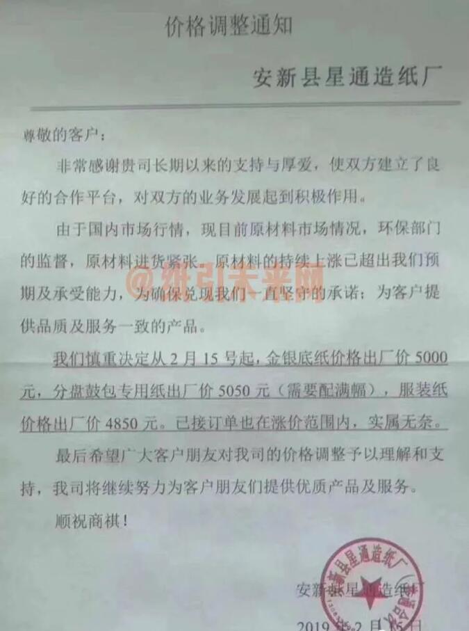2月15日,安新縣星通造紙廠發布漲價函: 2月15號起,金銀底紙價格出廠價5000元,分盤鼓包專用紙出廠價5050元(需要配滿幅),服裝紙價格出廠價4850元。 已接訂單也在漲價范圍內。