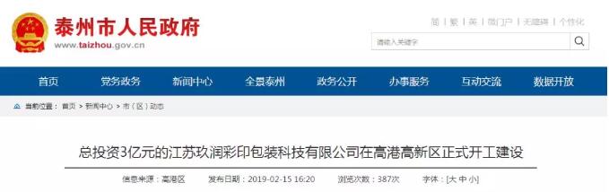 江蘇玖潤彩印包裝科技有限公司于2月14日上午在江蘇泰州高港高新區(qū)舉行了開工典禮,項(xiàng)目總投資3億元,預(yù)計(jì)可實(shí)現(xiàn)年生產(chǎn)包裝紙板3億平方米,原紙10萬噸的進(jìn)出吞吐量。