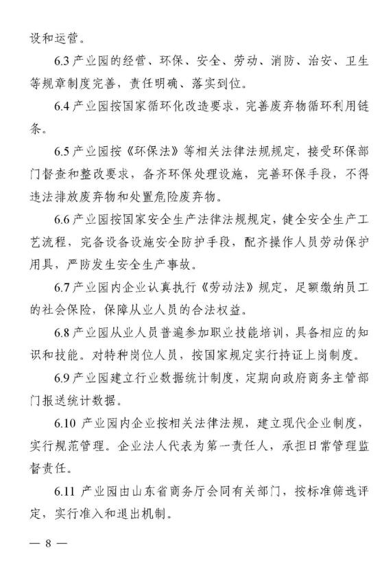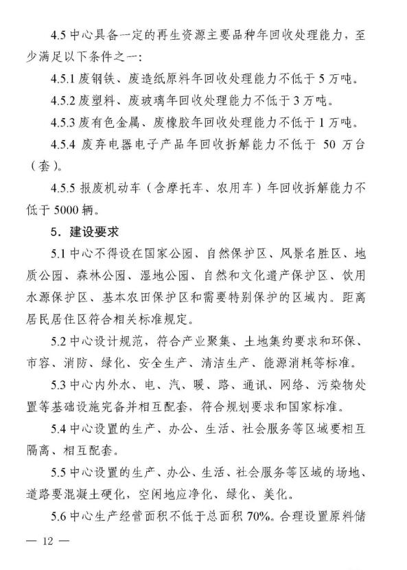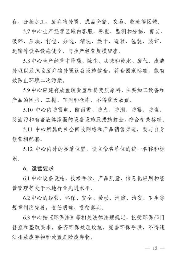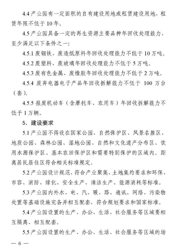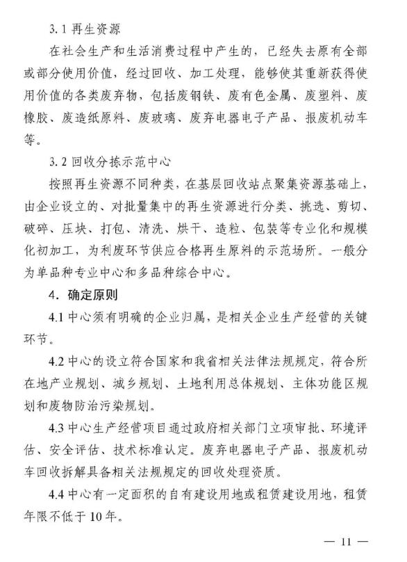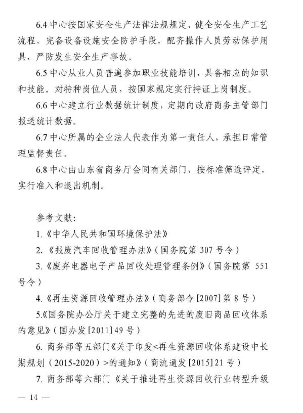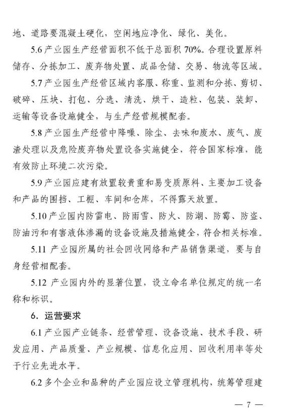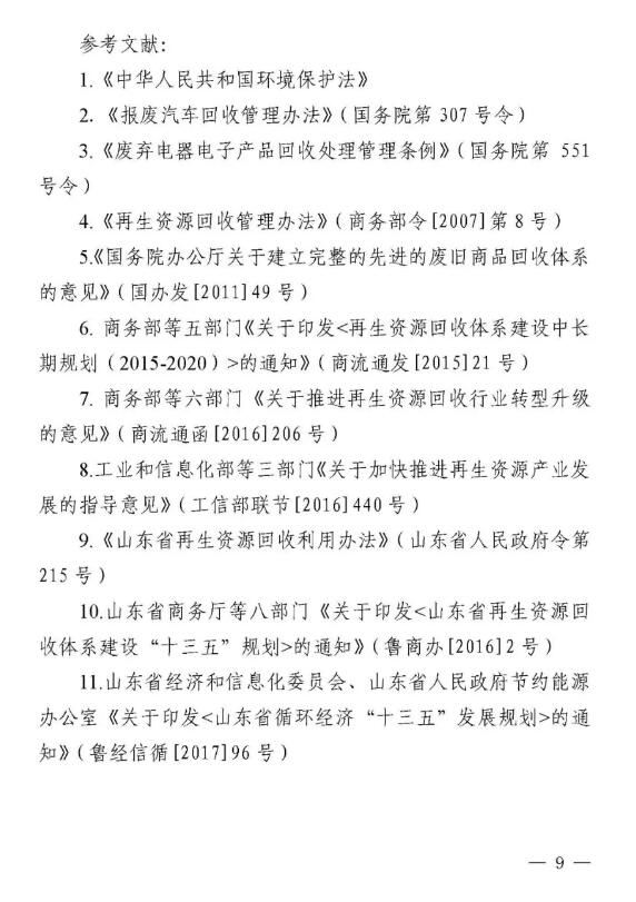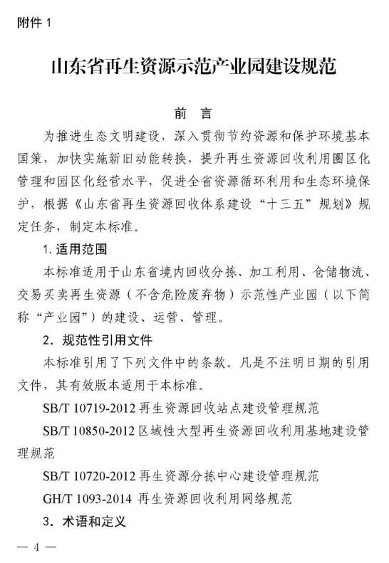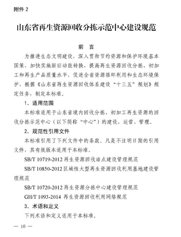 近日,山東省商務廳等八部門聯合下發《山東省再生資源示范產業園建設規范》和《山東省再生資源回收分揀示范中心建設規范》,這是全國第一個省級再生資源回收園區和回收分揀示范中心建設規范。 兩個《建設規范》明確示范產業園、回收分揀示范中心建設標準,須符合當地產業規劃、城鄉規劃、土地利用總體規劃、主體功能區規劃和廢物防治污染規劃,對再生資源主要品種加工能力提出具體要求。按照“綠色、環保、可持續發展”的要求,特別強調不得設在國家公園、自然保護區、風景名勝區、地質公園、森林公園、濕地公園、自然和文化遺產分布區、飲用水源保護區、基本農田保護區和需要特別保護的區域內;生產經營中降噪、除塵、去味和廢水、廢氣、廢渣處理以及危險廢棄物處置設備設施健全,符合國家標準,能有效防止環境二次污染。 根據《建設規范》要求,山東省商務廳擬于2019年6月會同有關部門評定第一批示范產業園、回收分揀示范中心。 根據規范要求,回收分揀示范中心要具備一定的再生資源主要品種年回收處理能力,至少滿足以下條件之一: (1)廢鋼鐵、廢造紙原料年回收處理能力不低于5萬噸。 (2)廢塑料、廢玻璃年回收處理能力不低于3萬噸。 (3)廢有色金屬、廢橡膠年回收處理能力不低于1萬噸。 (4)廢棄電器電子產品年回收拆解能力不低于50萬臺(套)。 (5)報廢機動車(含摩托車、農用車)年回收拆解能力不低于5000輛。
