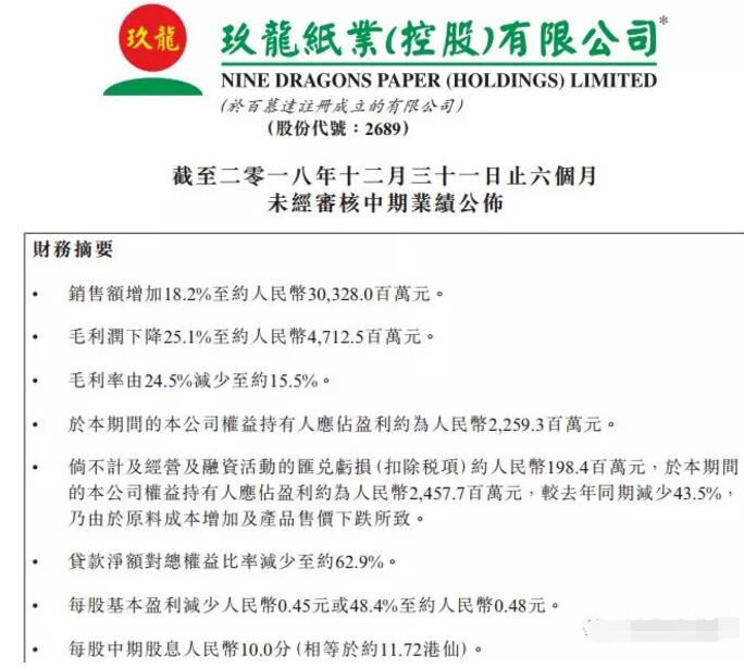 2月26日晚間,玖龍紙公布其截至2018年12月31日底止中期業績。由于原材料成本的增加及產品售價的下跌,玖龍紙業毛利率出現顯著下滑,拖累整體業績表現。 同時,玖龍紙業計劃新增四臺箱板紙機,產能合計205萬噸/年,將于今年2-3季度陸續投產。4臺紙機投產后,再加上美國4家工廠的升級改造和擴產,玖龍紙業的總產能到2021年底將超過1900萬噸。