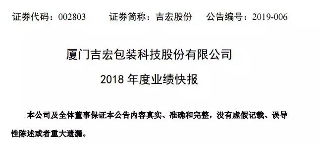 廈門吉宏包裝科技股份有限公司于2月25日發布了2018年度業績快報。報告顯示,公司的營業總收入、營業利潤、利潤總額、凈利潤、每股收益、加權平均凈資產收益率均比上年同期實現較大幅度增長,其中,歸屬于該公司股東的凈利潤20,568.07萬元,較上年同期增長156.99%。