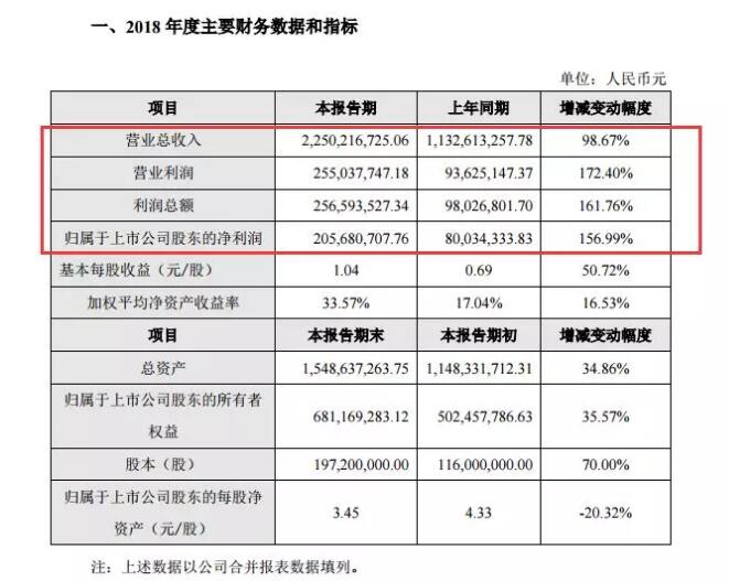 廈門吉宏包裝發布的2018年度業績快報顯示,公司營業總收入225,021.67萬元,較上年同期增長98.67%;營業利潤25,503.77萬元,較上年同期增長172.40%;利潤總額25,659.35萬元,較上年同期增長161.76%;實現歸屬于上市公司股東的凈利潤20,568.07萬元,較上年同期增長156.99%;基本每股收益1.04元,較上年同期增長50.72%;加權平均凈資產收益率33.57%,較上年同期增加16.53%。 2018年度,公司通過拓展優化快消品包裝,助力公司互聯網業務(精準營銷及以精準營銷為工具的跨境電商),業務發展良好,收益情況較好。因此,公司營業總收入、營業利潤、利潤總額、凈利潤、每股收益、加權平均凈資產收益率均比上年同期實現較大幅度增長。 本報告期,因資本公積金轉增股本,期末總股本19,720.00萬股較本報告期初增長70.00%,歸屬于上市公司股東的每股凈資產3.45元,較本報告期初下降20.32%。本報告期末,公司總資產154,863.73萬元,較本報告期初增長34.86%;歸屬于上市公司股東的所有者權益68,116.93萬元,較本報告期初增長35.57%;主要原因為報告期內公司原有經營業務規模擴大、營業收入增加,并收購新公司,相應資產、負債、公司所有者權益增加共同影響所致。業績詳情如下表所示: