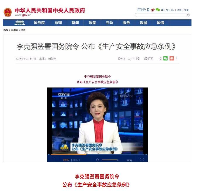 新華社北京3月1日電日前,國務院總理李克強簽署國務院令,公布《生產安全事故應急條例》(以下簡稱《條例》),自2019年4月1日起施行。 黨中央和國務院高度重視生產安全事故應急工作。為了解決生產安全事故應急工作中存在的突出問題,提高生產安全事故應急工作的科學化、規范化和法治化水平,《條例》以安全生產法和突發事件應對法為依據,對生產安全事故應急工作體制、應急準備、應急救援等作了規定。 一是明確應急工作體制!稐l例》規定,國務院統一領導全國的生產安全事故應急工作,縣級以上地方人民政府統一領導本行政區域內的生產安全事故應急工作?h級以上人民政府行業監管部門分工負責、綜合監管部門指導協調,基層政府及派出機關協助上級人民政府有關部門依法履職。 二是強化應急準備工作!稐l例》規定,縣級以上人民政府及其負有安全生產監督管理職責的部門和鄉、鎮人民政府以及街道辦事處等地方人民政府派出機關應當制定相應的生產安全事故應急救援預案,并依法向社會公布。生產經營單位應當制定相應的生產安全事故應急救援預案,并向本單位從業人員公布。《條例》還對建立應急救援隊伍、應急值班制度,從業人員應急教育和培訓,儲備應急救援裝備和物資等內容進行明確規定。 三是規范現場應急救援工作!稐l例》規定,發生生產安全事故后,生產經營單位應當立即啟動生產安全事故應急救援預案,采取相應的應急救援措施,并按照規定報告事故情況。有關地方人民政府及其部門接到生產安全事故報告后,按照預案的規定采取搶救遇險人員,救治受傷人員,研判事故發展趨勢,防止事故危害擴大和次生、衍生災害發生等應急救援措施,按照國家有關規定上報事故情況。有關人民政府認為有必要的,可以設立應急救援現場指揮部,指定現場指揮部總指揮,參加應急救援的單位和個人應當服從現場指揮部的統一指揮。 《條例》還對地方各級人民政府和生產經營單位在應急準備、應急救援方面的法律責任作出規定。  生產安全事故應急條例 第一章 總則 第一條 為了規范生產安全事故應急工作,保障人民群眾生命和財產安全,根據《中華人民共和國安全生產法》和《中華人民共和國突發事件應對法》,制定本條例。 第二條 本條例適用于生產安全事故應急工作;法律、行政法規另有規定的,適用其規定。 第三條 國務院統一領導全國的生產安全事故應急工作,縣級以上地方人民政府統一領導本行政區域內的生產安全事故應急工作。生產安全事故應急工作涉及兩個以上行政區域的,由有關行政區域共同的上一級人民政府負責,或者由各有關行政區域的上一級人民政府共同負責。 縣級以上人民政府應急管理部門和其他對有關行業、領域的安全生產工作實施監督管理的部門(以下統稱負有安全生產監督管理職責的部門)在各自職責范圍內,做好有關行業、領域的生產安全事故應急工作。 縣級以上人民政府應急管理部門指導、協調本級人民政府其他負有安全生產監督管理職責的部門和下級人民政府的生產安全事故應急工作。 鄉、鎮人民政府以及街道辦事處等地方人民政府派出機關應當協助上級人民政府有關部門依法履行生產安全事故應急工作職責。 第四條 生產經營單位應當加強生產安全事故應急工作,建立、健全生產安全事故應急工作責任制,其主要負責人對本單位的生產安全事故應急工作全面負責。 第二章 應急準備 第五條 縣級以上人民政府及其負有安全生產監督管理職責的部門和鄉、鎮人民政府以及街道辦事處等地方人民政府派出機關,應當針對可能發生的生產安全事故的特點和危害,進行風險辨識和評估,制定相應的生產安全事故應急救援預案,并依法向社會公布。 生產經營單位應當針對本單位可能發生的生產安全事故的特點和危害,進行風險辨識和評估,制定相應的生產安全事故應急救援預案,并向本單位從業人員公布。 第六條 生產安全事故應急救援預案應當符合有關法律、法規、規章和標準的規定,具有科學性、針對性和可操作性,明確規定應急組織體系、職責分工以及應急救援程序和措施。 有下列情形之一的,生產安全事故應急救援預案制定單位應當及時修訂相關預案: (一)制定預案所依據的法律、法規、規章、標準發生重大變化; (二)應急指揮機構及其職責發生調整; (三)安全生產面臨的風險發生重大變化; (四)重要應急資源發生重大變化; (五)在預案演練或者應急救援中發現需要修訂預案的重大問題; (六)其他應當修訂的情形。 第七條 縣級以上人民政府負有安全生產監督管理職責的部門應當將其制定的生產安全事故應急救援預案報送本級人民政府備案;易燃易爆物品、危險化學品等危險物品的生產、經營、儲存、運輸單位,礦山、金屬冶煉、城市軌道交通運營、建筑施工單位,以及賓館、商場、娛樂場所、旅游景區等人員密集場所經營單位,應當將其制定的生產安全事故應急救援預案按照國家有關規定報送縣級以上人民政府負有安全生產監督管理職責的部門備案,并依法向社會公布。 第八條 縣級以上地方人民政府以及縣級以上人民政府負有安全生產監督管理職責的部門,鄉、鎮人民政府以及街道辦事處等地方人民政府派出機關,應當至少每2年組織1次生產安全事故應急救援預案演練。 易燃易爆物品