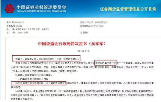 另一位被處罰者吳學軍控制其本人及“王某萍”“肖某龍”賬戶,在內幕信息敏感期內買入“太陽紙業”791.06萬股,賣出5.83萬股,吳學軍賬戶組盈利1104.19萬元,被證監會“沒一罰一”罰沒2208.38萬元。