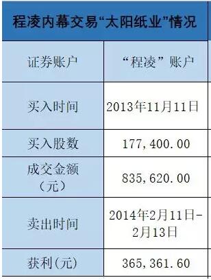 在內幕信息敏感期內,“程凌”賬戶共買入“太陽紙業”17.74萬股,成交金額83.56萬元,2014年2月11日至2月13日全部賣出,賬戶盈利36.54萬元。據此,程凌被證監會“沒一罰一”共計罰沒73.07萬元。