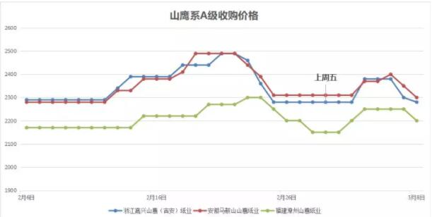 上周廢紙價格指數先漲后跌,但整體來說走勢相對較為平緩,廢紙價格單次漲跌幅度多在50元/噸之內。截止03月08日,廢紙價格指數從最高值回落至2096.79點。 1、山鷹系A級收購價格走勢