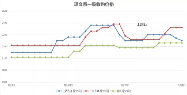 上周山鷹系A級廢紙收購價格略有波動,但對比3月1日收購價格,其變化并不算太大。截止3月8日浙江山鷹與上周五價格持平,安徽山鷹下跌了10元/噸,福建山鷹則上漲了50元/噸。 目前以安徽山鷹最高,為2300元/噸;福建山鷹最低,為2200元/噸。 2、理文系一級收購價格走勢