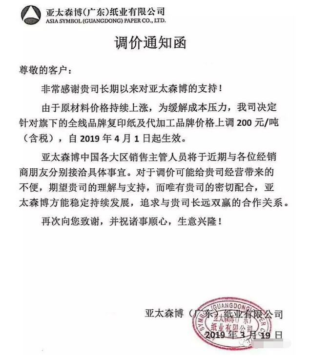 亞太森博(廣東)紙業(yè)有限公司:由于原材料價格持續(xù)上漲,為緩解成本壓力,我司決定針對旗下的全線品牌復(fù)印紙及代加工品牌價格上調(diào)200元/噸(含稅),自2019年4月1日起生效。