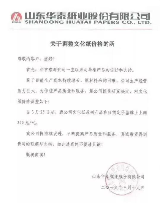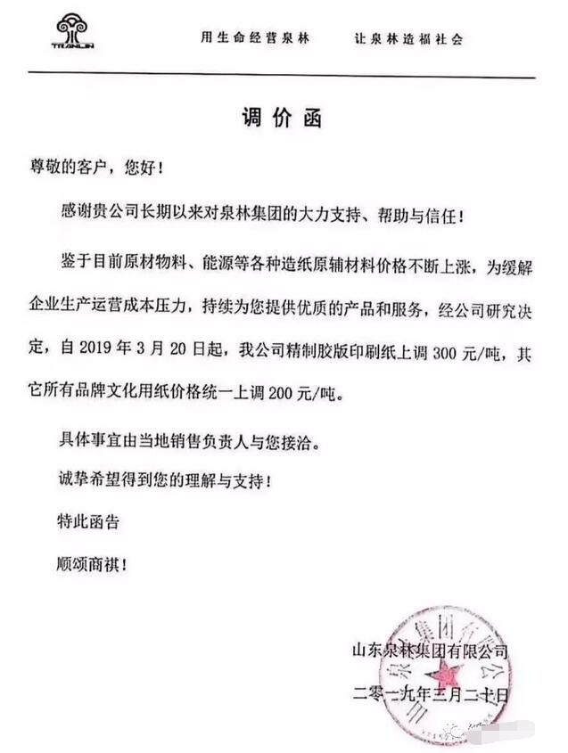 山東泉林集團有限公司:鑒于目前原材物料、能源等各種造紙原輔材料價格不斷上漲,為緩解企業(yè)生產(chǎn)運營成本壓力,持續(xù)為您提供優(yōu)質(zhì)的產(chǎn)品和服務(wù),經(jīng)公司研究決定,自2019年3月20日起,我公司精制膠版印刷紙上調(diào)300元/噸,其它所有品牌文化用紙價格統(tǒng)一上調(diào)200元/噸。