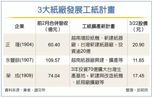 榮成擴(kuò)大臺(tái)灣基地,2020年工紙年產(chǎn)能將超越永豐余 根據(jù)臺(tái)灣媒體的報(bào)道,榮成計(jì)劃在三年內(nèi)投資70億元,分三階段擴(kuò)大臺(tái)灣生產(chǎn)基地,進(jìn)行新建及升級(jí)改造低碳造紙工紙廠紙機(jī)、綠色包裝紙箱廠產(chǎn)線汰舊換新、自動(dòng)化智慧化升級(jí)改造等項(xiàng)目。 2020年底前將工紙年產(chǎn)能增至85萬噸,將超越永豐余,僅次于正隆,同時(shí)拓展國際競爭力,粗估三年后營收增加約50億元。 榮成計(jì)劃在彰化二林廠新建一臺(tái)年產(chǎn)20萬噸紙機(jī),升級(jí)改造一臺(tái)紙機(jī),使工紙年產(chǎn)能從目前65萬噸增至85萬噸,并優(yōu)化產(chǎn)品組合,切入國內(nèi)高品質(zhì)輕磅化的紙箱紙板市場,并拓展東南亞市場。 (說明:以上單位均指“新臺(tái)幣”。) 野心勃勃,在華中新增五大投資項(xiàng)目 在臺(tái)灣的三大工紙巨頭當(dāng)中,榮成曾經(jīng)極度看好大陸市場前景,幾乎是把一籃子雞蛋都放在了大陸市場。早在2016年,臺(tái)灣“榮成紙業(yè)”董事長鄭瑛彬曾表示,中國大陸工紙市場可望再走升10年,因此榮成聚焦大陸,除了在平湖廠增產(chǎn)外,也向湖北插旗。