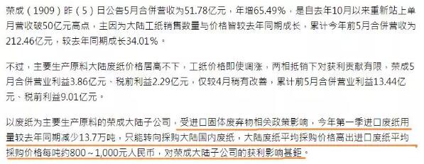 2014年9月19日,在湖北省委常委、宣傳部部長尹漢寧,副省長甘榮坤出席并見證下,投資9億美元的湖北榮成紙業(yè)年產(chǎn)150萬噸高檔箱紙板及熱電聯(lián)產(chǎn)項(xiàng)目在漢簽約。此后一年,中央政府開始加強(qiáng)長江經(jīng)濟(jì)帶的規(guī)劃建設(shè),沿長江一帶不再規(guī)劃大型造紙項(xiàng)目,榮成紙業(yè)驚險(xiǎn)地?fù)尣教と腴L江經(jīng)濟(jì)帶,并順利在中心地帶落子布局,似乎一切都印證了鄭瑛彬的判斷。 2016年,榮成紙業(yè)不再掩飾其逐鹿大陸的野心。是年10月,榮成(1909)在臺(tái)灣完成7年期19.9億人民幣(近96億臺(tái)幣)聯(lián)貸案簽約,為該公司史上最高金額聯(lián)貸案,將全數(shù)用在投資華中新產(chǎn)能上。此后,榮成宣布在武漢、仙桃、荊州、常德四地投建大型紙箱廠,進(jìn)一步壯大其一級(jí)廠的規(guī)模。 2017年,中國大陸迎來了史無前例的紙業(yè)瘋狂,雖然于當(dāng)年11月投產(chǎn)的湖北榮只抓住了這一超級(jí)大牛市的尾巴,但榮成在無錫、平湖和昆山等地的生產(chǎn)基地賺得盆滿缽滿。2017年,榮成紙業(yè)錄得100億人民幣的史上最佳業(yè)績。 蜜月結(jié)束,“榮成”遭遇三大挫折 相愛總是簡單,相處太難!榮成紙業(yè)剛剛經(jīng)歷過2017年的高潮之后,立即迎來了2018年的大轉(zhuǎn)折。 2018年1月18日,臺(tái)灣榮成紙業(yè)發(fā)布一則公告,稱受中國環(huán)保驗(yàn)收及進(jìn)口廢紙審批進(jìn)度影響,并配合投產(chǎn)后初次檢修調(diào)試,湖北榮成紙業(yè)1號(hào)紙機(jī)自1月18日起至4月中旬將停機(jī)檢修維護(hù),停產(chǎn)3個(gè)月。由于遲遲拿不到進(jìn)口廢紙批文,湖北榮成陷入到無米下鍋的境地。