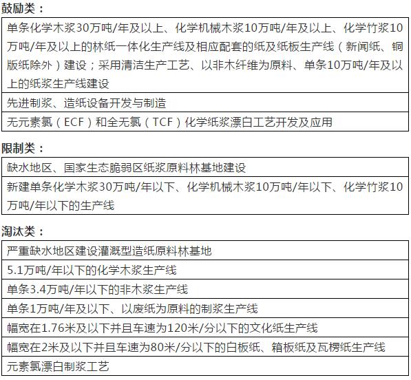 對比《產業(yè)結構調整指導目錄(2011年本)(修正)》,鼓勵類沒有變化;限制類中去除了“新聞紙、銅版紙生產線”;“元素氯漂白制漿工藝”則從限制類調整到了淘汰類。