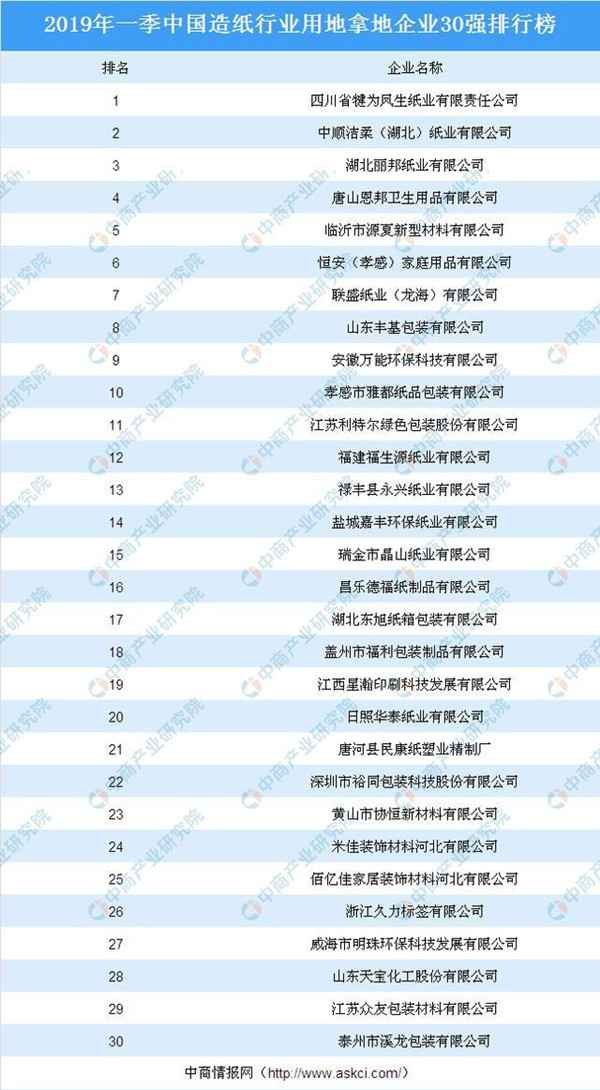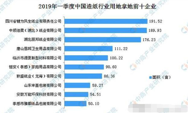 據(jù)榜單顯示,進(jìn)入榜單前十企業(yè)分別為:四川省犍為鳳生紙業(yè)有限責(zé)任公司、中順潔柔(湖北)紙業(yè)有限公司、湖北麗邦紙業(yè)有限公司、唐山恩邦衛(wèi)生用品有限公司、臨沂市源夏新型材料有限公司、恒安(孝感)家庭用品有限公司、聯(lián)盛紙業(yè)(龍海)有限公司、山東豐基包裝有限公司、安徽萬能環(huán)保科技有限公司、孝感市雅都紙品包裝有限公司。其中,四川省犍為鳳生紙業(yè)有限責(zé)任公司2019年一季度用地拿地面積最多,達(dá)191.52畝。
