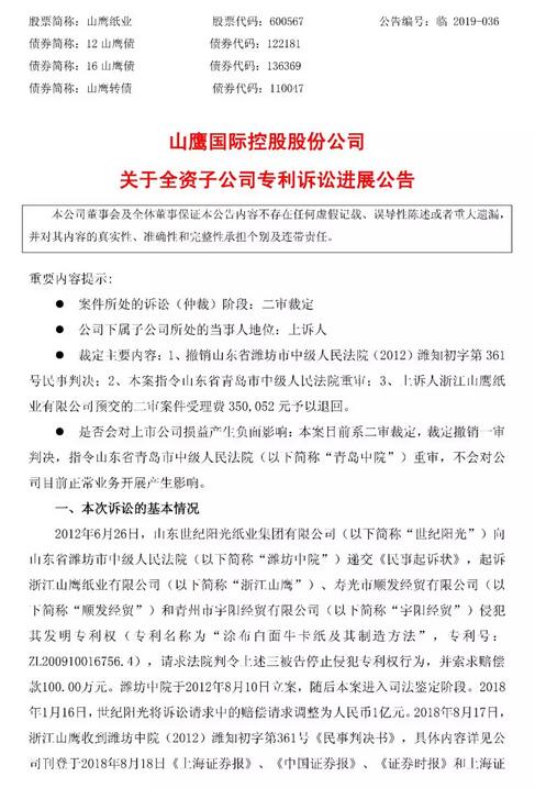 4月10日,山鷹國際控股股份公司發(fā)布關(guān)于全資子公司專利訴訟進(jìn)展公告,其全資子公司浙江山鷹紙業(yè)有限公司(下稱浙江山鷹紙業(yè))收到山東高院裁定。撤銷濰坊市中級人民法院作出的一審侵權(quán)判決,指令青島市中級人民法院重審。 案情回顧 2012年6月26日,山東世紀(jì)陽光紙業(yè)集團(tuán)有限公司(以下簡稱“世紀(jì)陽光”)向?yàn)H坊中院起訴浙江山鷹紙業(yè)有限公司(以下簡稱“浙江山鷹”)、壽光市順發(fā)經(jīng)貿(mào)有限公司(以下簡稱“順發(fā)經(jīng)貿(mào)”)及青州市宇陽經(jīng)貿(mào)有限公司(以下簡稱“宇陽經(jīng)貿(mào)”)侵犯其發(fā)明專利權(quán)(專利名稱為“涂布白面牛卡紙及其制造方法”,專利號:ZL200910016756.4),請求法院判令三被告停止侵犯專利權(quán)行為,并索求賠償款100.00萬元。濰坊中院于2012年8月10日立案,隨后本案進(jìn)入司法鑒定階段。 2013年4月16日,世紀(jì)陽光申請撤回對宇陽經(jīng)貿(mào)的訴訟請求。 2013年7月,濰坊中院確定由北京國威知識產(chǎn)權(quán)司法鑒定中心對公證封存的樣品技術(shù)特征進(jìn)行鑒定。 2016年5月5日,濰坊中院召集雙方當(dāng)事人并告知北京國威知識產(chǎn)權(quán)司法鑒定中心無法出具司法鑒定報告,需進(jìn)行第二次司法鑒定。浙江山鷹就法院啟動第二次司法鑒定提出異議。 2017年7月,北京紫圖知識產(chǎn)權(quán)司法鑒定中心依據(jù)齊魯工業(yè)大學(xué)下屬某實(shí)驗(yàn)室提供的紙張檢測報告,作出被控侵權(quán)產(chǎn)品技術(shù)特征與ZL200910016756.4權(quán)利要求1對應(yīng)技術(shù)特征相同的鑒定意見。 2018年1月16日,世紀(jì)陽光將訴訟請求的賠償部分變更要求為賠償人民幣1億元。 濰坊中院分別于2018年1月22日、2018年4月16日、2018年5月28日對本案進(jìn)行了開庭審理。 浙江山鷹在一審?fù)徶刑岢隽巳缦轮鲝埐⑻峁┝讼鄳?yīng)證據(jù): 1、浙江山鷹的涂布牛卡紙項(xiàng)目系簾式涂布牛卡紙,研發(fā)于2009年,2011年4月13日,浙江山鷹向國家知識產(chǎn)權(quán)局申請并取得了發(fā)明專利,專利名稱為“一種本色涂布牛卡紙及其制造方法”,專利號為ZL201110091856.0。浙江山鷹使用自己的專利技術(shù)生產(chǎn)出來的產(chǎn)品,并未侵害世紀(jì)陽光的專利權(quán);