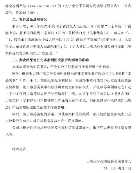 涉案專利摘要 2、鑒定機(jī)構(gòu)作出的《鑒定意見書》存在重大瑕疵; 3、原告世紀(jì)陽光主張一億元賠償金額沒有事實(shí)依據(jù); 4、浙江山鷹和世紀(jì)陽光均是購買的維美德公司產(chǎn)品,維美德公司明確指出兩家公司的造紙?jiān)O(shè)備在壓榨部和涂布部技術(shù)方面存在區(qū)別,兩種技術(shù)在生產(chǎn)產(chǎn)品的工藝實(shí)現(xiàn)上并不相同; 5、浙江山鷹生產(chǎn)的產(chǎn)品依托的是簾式涂布機(jī),而世紀(jì)陽光依托的是刮刀涂布機(jī),兩者生產(chǎn)的是不同的產(chǎn)品。 2018年8月,山東省濰坊市中級人民法院的一審民事判決書((2012)濰知初字第361號)判決如下: 1、浙江山鷹、順發(fā)經(jīng)貿(mào)立即停止侵害涉案發(fā)明專利權(quán)的行為; 2、浙江山鷹于本判決生效之日起十日內(nèi),賠償原告李文君(原告“世紀(jì)陽光”)經(jīng)濟(jì)損失及合理開支共計(jì)6,165.0435萬元; 3、順發(fā)經(jīng)貿(mào)在浙江山鷹賠償原告經(jīng)濟(jì)損失及合理開支5萬元范圍內(nèi)承擔(dān)連帶責(zé)任; 4、駁回世紀(jì)陽光的其他訴訟請求; 2018年8月25日浙江山鷹向山東省高級人民法院提起上訴。 2019年4月10日浙江山鷹發(fā)布訴訟公告:近日收到山東高院(2019)魯民終11號《民事裁定書》,裁定如下: 1、撤銷山東省濰坊市中級人民法院(2012)濰知初字第361號民事判決; 2、本案指令山東省青島市中級人民法院重審; 3、上訴人浙江山鷹紙業(yè)有限公司預(yù)交的二審 附訴訟公告: