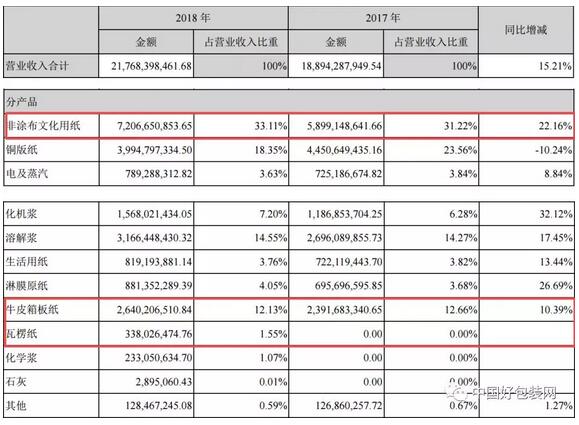 分產品來看,太陽紙業的非涂布文化用紙是營收的主要來源,實現營收72.06億元,占總營收的33.11%,比去年同期增長22.16%;毛利率為27.29%,比上年降低0.77%。 而與紙包裝行業相關性密切的牛皮箱板紙、瓦楞紙,營收分別為26.40億元、3.38億元;分別占總營收的12.13%、1.55%。其中,牛皮箱板紙業務毛利率為11.24%,比上年降低8.64%。