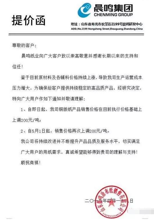 導(dǎo)語:近期包裝紙市場表面穩(wěn)定,其實躁動不安。白卡紙龍頭企業(yè)率先發(fā)出5月漲價函,醞釀漲勢;白板紙需求不旺,市場相對穩(wěn)定;箱板紙、瓦楞紙出貨壓力大,紙企提價欲望強烈。昨日銅版紙緊隨其后,晨鳴、華泰、太陽聯(lián)合提漲200元/噸。 山東晨鳴紙業(yè):鑒于目前原材料及輔料價格上漲,導(dǎo)致我司生產(chǎn)運營成本壓力增大,為確保給客戶提供持續(xù)穩(wěn)定的高品質(zhì)產(chǎn)品,特向廣大用戶作如下通知并敬請理解:自即日起,我司銅版紙產(chǎn)品銷售價格在目前執(zhí)行價格基礎(chǔ)上上調(diào)200元/噸。 自5月1日起,銷售價格再次上調(diào)200元/噸!