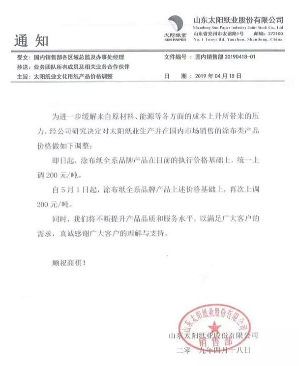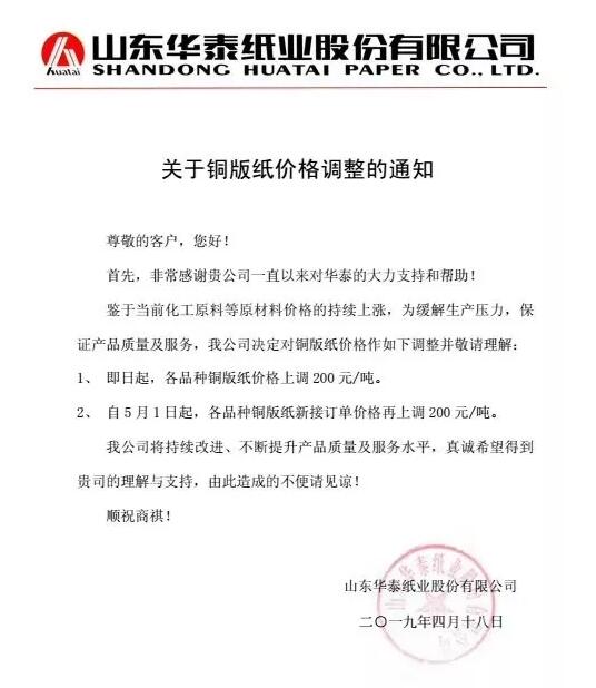 山東華泰紙業(yè)股份有限公司:鑒于當前化工原料等原材料價格的持續(xù)上漲,為緩解生產(chǎn)壓力,保證產(chǎn)品質(zhì)量和服務(wù),我公司決定對銅版紙價格作如下調(diào)整并敬請理解:即日起,各品種銅版紙價格上調(diào)200元/噸。 自5月1日起,各品種銅版紙新接訂單價格再上調(diào)200元/噸!
