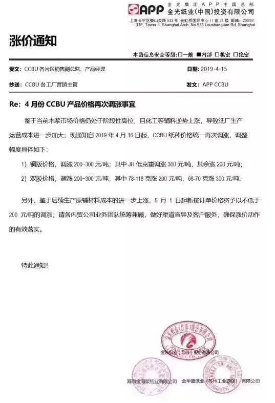 APP:鑒于當前木漿市場價格仍處于階段性高位,且化工等輔料逆勢上漲,導(dǎo)致紙廠生產(chǎn)經(jīng)營成本進一步加大;現(xiàn)通知自2019年4月16日起,CCBU紙種價格統(tǒng)一再次調(diào)漲,調(diào)整幅度具體如下: 1、銅版價格,調(diào)漲200-300元/噸;其中JH低克重調(diào)漲300元/噸,其余漲200元/噸; 2、雙膠價格,調(diào)漲200-300元/噸;其中78-118克漲200元/噸,68-70克漲300元/噸。