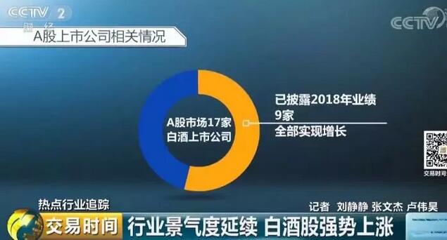 河北衡水老白干酒業股份有限公司總經理 王占剛:2019年,我國白酒行業呈現兩個特點:第一,白酒的品牌集中度越來越高,尤其是中高端產品;第二,整個白酒行業的競爭加劇,出現了馬太效應,強者恒強。我們要抓消費者心智,原來我們的競爭都是在渠道層面,未來我們的競爭要在品牌層面。 行業景氣度延續 白酒股強勢上漲 白酒行業緊跟消費升級趨勢,呈現出了向好的局面,上市龍頭酒企近年來也大都有著靚麗的業績。 近期,在A股市場的17家白酒上市公司中,有9家公司披露了2018年業績,全部實現比較明顯的增長。其中: