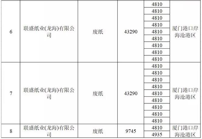 與4月4日公布的第五批廢紙進口許可名單相比,本批名單在核準廢紙總量、企業數量方面都有較大幅度下降。其中,核準廢紙總量更是暴跌90%。以下為具體名單: