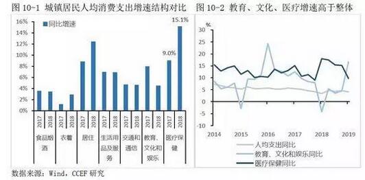 與此同時,隨著我國老年人口的逐年上升,以及收入水平上升后人們對健康需求的提高,醫療保健類消費占比在逐年上升,在2018年城鎮居民人均消費各項支出中,增幅比例最大的就是醫療保健支出,同比增速高達15.1%,比2017年提高近6個百分點;此外,二孩政策開放以及高收入階層精神追求的提高,導致家庭教育支出的相應增長。數據顯示,人均醫療與教育、文化支出在過去5年分別累計增長80%、50%,高于同期整體消費支出僅的增長速度。因此,醫療、教育、文化等消費在消費支出中的占比越來越大。