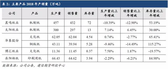 三、主要產品2018年產銷量 晨鳴和太陽兩家年報沒有按照細分品種產銷量進行發布,故統稱為機制紙。華泰按照新聞紙、文化紙、銅版紙和包裝紙發布,這里選取文化紙和銅版紙。岳陽林紙按照印刷用紙、包裝用紙、辦公用紙和工業用紙發布,根據這四類產量規模,選取印刷用紙。而博匯主要產品為白卡,2018年白卡生產量131.83萬噸。 對比這五家主要產品產銷量,庫存量方面,2018年庫存較上年增長顯著,平均增幅50%以上。銷售量方面,除太陽和博匯銷售量同比增長,其余銷售量較上年均下滑。