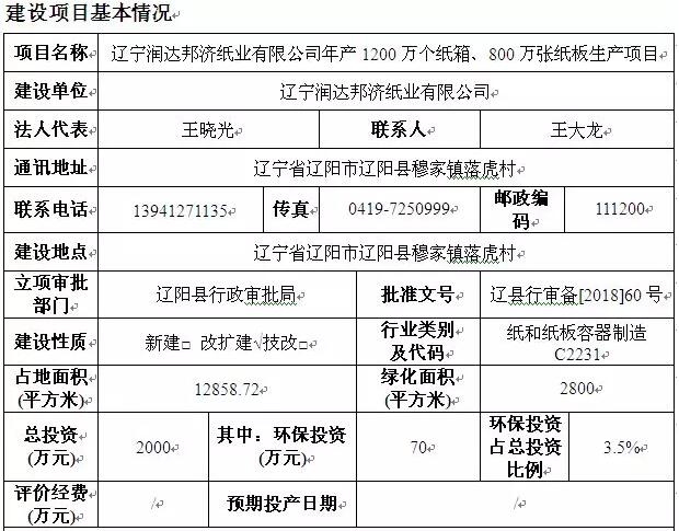 遼寧潤達邦濟紙業(yè)有限公司位于遼寧省遼陽市遼陽縣穆家鎮(zhèn)落虎村。公司主營業(yè)務為紙制品制造;紙制品剪切加工;包裝裝潢印刷等。 該公司于2018年實施紙箱生產(chǎn)項目,項目占地面積約12858.72m2,建筑面積約11480m2;設(shè)有生產(chǎn)線1條,年產(chǎn)紙箱400萬個。由于當時紙箱生產(chǎn)工藝簡單,不涉及化學處理工藝,因此該項目環(huán)評類別為登記表。企業(yè)于2018年10月10日填報了遼寧潤達邦濟紙業(yè)有限公司紙箱生產(chǎn)項目環(huán)境影響登記表,并登記備案,備案文號201821102100000039號。