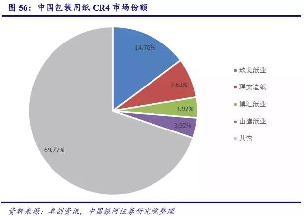 從產能方面的數據來看,包裝用紙行業產能前四的公司分別是玖龍紙業、理文造紙、博匯紙業和山鷹紙業。其中,玖龍紙業、理文造紙在港股上市,是目前國內造紙行業規模最大的兩家公司;博匯紙業和山鷹紙業在A股上市。玖龍紙業目前有約1335萬噸包裝用紙產能,公司在廣東東莞、重慶、天津等地均有設廠,產能在全國范圍內布局十分廣泛,牢牢占據包裝用紙行業的龍頭地位。而位居第二的理文造紙,也有將近700萬噸包裝用紙產能。根據2018年各公司的產能數據測算,包裝用紙行業的CR4僅為30.23%,CR8也僅為38.92%,行業集中度較低。