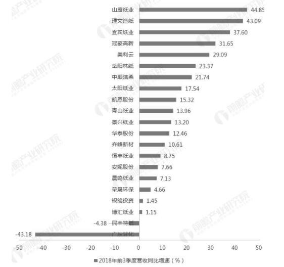 數據來源:前瞻產業研究院整理 (備注:1-2月、6月全國機制紙及紙板累計產量增速為-2.5%、-0.7%) 超1/3企業凈利潤同比下滑,業績表現欠佳 目前,包括港股上市的玖龍紙業和理文紙業在內,國內造紙行業的主要有22家上市公司。從2017年全年的業績表現來看,造紙行業2017年的業績表現普遍向好,所有公司的營收都有所擴張,其中僅安妮股份、廣東甘化2家公司的凈利潤出現下滑,數量占比不到10%。其中,年營收規模超過100億元的有6家公司,凈利潤規模突破20億元的有5家公司,玖龍紙業在營收規模和凈利潤規模上均遙遙領先與其他企業,穩居行業第一。總體來看,目前在營收和凈利潤規模處于行業領先地位的主要是玖龍紙業、晨鳴紙業、理文紙業、太陽紙業和山鷹紙業。 而從2018年前三季度造紙行業內企業的業績表現來看,相較于2017年同期出現了明顯下滑。具體來看,由于行業龍頭玖龍紙業未披露最新財務數據,所以僅對其余21家公司進行分析。在營收方面,明豐特紙、廣東甘化兩家公司同比出現下滑;凈利潤表現更糟,有8家公司凈利潤出現同比下滑,數量占比超過了1/3,利潤下滑企業中更是包括了晨鳴紙業和博匯紙業等營收體量較大的公司。因此,總體來看,2018年前3季度,我國造紙企業業績出現頹勢,發展面臨一定的困境,而這主要是因為原材料供給收緊和下游需求不振所致。 2018年前三季度21家造紙上市公司營收、利潤增速統計情況