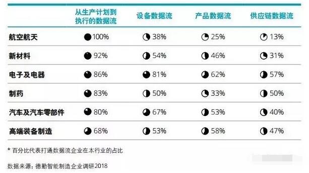 ▲ 生產數據流主要類型 產品數據流 打通產品數據流主要體現在產品全生 命周期數字一體化和產品全生命周期可追溯。產品全生命周期數字一體化以縮短研發周期為核心,主要應用基于模型定義(MBD)技術進行產品研發、建設 產品全生命周期管理系統(PLM)等。研發是數字化工廠“數據鏈條”的起點, 研發環節產生的數據將在工廠的各個系統間實時傳遞,數據的同步更新避免了傳統制造企業經常出現的由于溝通不暢產生的差錯,也使得工廠的效率大大提升,縮短產品研制周期。產品全生命周期可追溯以提升產品質量管控為核心。 主要應用是讓產品在全生命周期具有唯一標識,應用傳感器、智能儀器儀表、工控系統等自動采集質量管理所需要數據,通過MES系統開展在線質量檢測和預警等。 供應鏈數據流 打通供應鏈數據流主要體現在供應鏈上下游協同優化,實現網絡協同制造。主要應用是建設跨企業制造資源協同平臺,實現企業間研發、管理和服務系統 的集成和對接,為接入企業提供研發設計、運營管理、數據分析、知識管理、信息安全等服務,開展制造服務和資源的動態分析和柔性配置。 德勤調研結果顯示,目前企業致力于打通從ERP到MES乃至現場設備的數據流,但這也僅是從生產到執行的打通,未來 還需將產品數據、供應鏈數據串聯。我們將生產數據流分為兩個環節:一、打通生產計劃與執行系統的數據流;二、執行與監控和現場設備的數據流。 結果顯示, 83%的受訪企業表示已打通ERP和MES的數據流打通。62%的企業繼續向 下打通MES到現場設備的數據流。但僅有47%的企業打通了產品數據流,44%的企業打通供應鏈數據流。而且考慮到我們調查的企業均為資質較好且為中等以上規模,這一系列比率顯然高于中國整體平均水平。