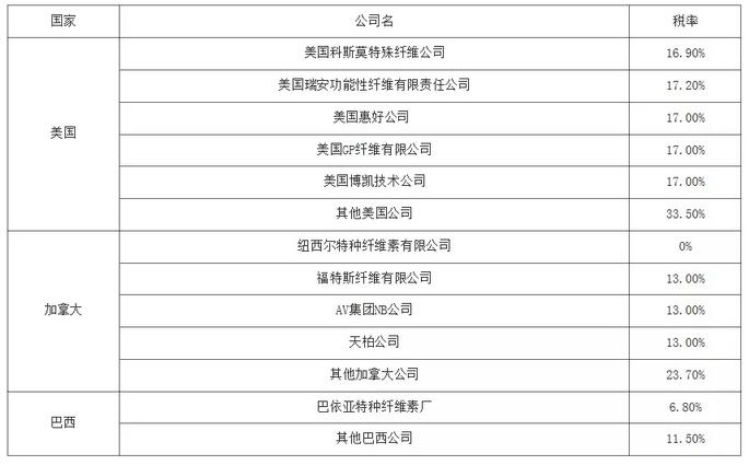 2014年4月對原產于美國、加拿大、巴西的溶解漿加征反傾銷稅,具體稅率見表1。2018年4月20日,我國做出繼續對進口漿粕產品征收反傾銷稅的決定。2019年4月6日對進口溶解漿反傾銷稅到期,商務部未公布繼續加征的決定。卓創分析,受溶解漿主要來源國轉移和國內新增產能釋放影響,此次取消反傾銷稅對市場影響有限。 表1 中國商務部對原產于美國、加拿大、巴西的溶解漿征收反傾銷稅稅率表