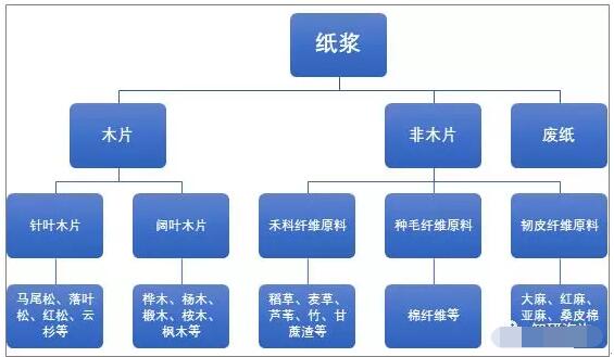 紙漿的原料來源主要為木片、非木片和廢紙。木片分為兩大類,分別是針葉木片和闊葉木片;非木片則主要有類,分別是禾科纖維原料、韌皮纖維原料和種毛纖維原料。廢紙漿是廢紙在回收后經過分類篩選、溫水浸漲,被重新打成紙漿以期再次利用的紙漿。 紙漿原料分類圖