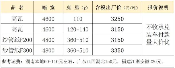 國產原紙:6月15日報價 衡山新金龍紙業: 高瓦110克:3250元/噸 高瓦120-140克:3150元/噸 紗管紙F200:3150元/噸 紗管紙F300:3350元/噸 說明: 高瓦門幅4600,紗管紙門幅4800,以上報價為含稅出廠價,不收承兌,可按需采購。裝車付款,量大價優。 參考運費: 湖南本地60-110元左右, 廣東江西湖北150左右,福建江浙安徽220元左右。 瀏陽永泰紙業: 高瓦90克:3450元 普瓦200克:2900元 說明: 門幅950-2450,以上報價為含稅出廠價,承兌加50,可以做特規格,需打預付款。裝車付款,首次下單有優惠。 參考運費: 湖南本地50-100元左右, 廣東江西湖北140左右,福建江浙安徽210元左右。裝車付款,首次下單有優惠。 國產原紙:6月14日報價 衡山新金龍紙業: 高瓦110克:3250元/噸 高瓦120-140克:3150元/噸 紗管紙F200:3150元/噸 紗管紙F300:3350元/噸 說明: 以上為含稅出廠現金價(不收承兌)。 運費: 湖南本地60-110元左右, 廣東江西湖北150左右,福建江浙安徽220元左右。裝車付款,量大價優! 河北 國產原紙:6月17日報價 華興紙業: 箱板紙120-140g:3150元 箱板紙150-160g:3100元 高強瓦楞紙110g:3150元 高強瓦楞紙120-140g:3100元 說明: 箱板紙幅寬5300,高瓦幅寬4400,以上報價為含稅出廠價,不收承兌。 參考運費: 河北本地30-150元,山東70-150,江蘇長三角160-250,浙江230-400,安徽160-300,湖南300-400,湖北200-300,河南90-160。 內蒙古 國產原紙:6月16日報價 內蒙古運籌工貿: