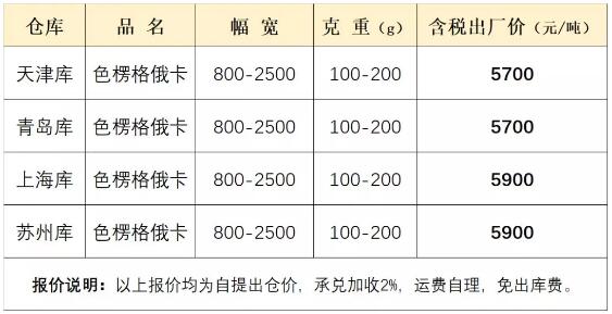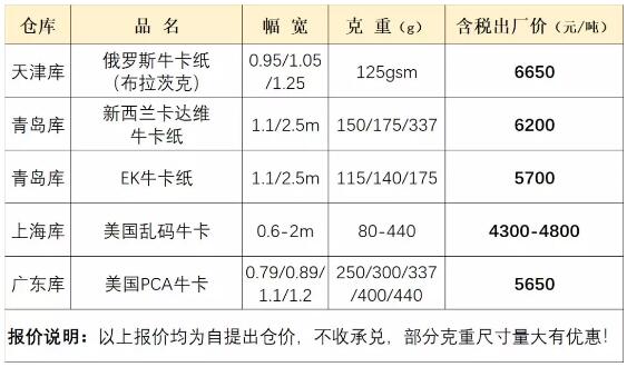 進口原紙:6月17日報價 內蒙古運籌工貿: 色楞格俄卡100g-200g:天津庫5700元 色楞格俄卡100g-200g:青島庫5700元 色楞格俄卡100g-200g:上海庫5900元 色楞格俄卡100g-200g:蘇州庫5900元 說明: 以上報價均為自提出倉價,承兌加收2%,運費自理,免出庫費。 進口原紙:6月15日報價 內蒙古運籌工貿: 色楞格俄卡100g-200g:天津倉庫5700元/噸 色楞格俄卡100g-200g:青島倉庫5700元/噸 色楞格俄卡100g-200g:上海倉庫5900元/噸 色楞格俄卡100g-200g:蘇州倉庫5900元/噸 說明: 幅寬800-2500。 以上報價均為自提出倉價,承兌加收2%。運費自理,免出庫費。 山東 特價原紙:6月17日報價 青島中嘉霖晟漿紙有限公司: 俄羅斯牛卡紙(布拉茨克)125gsm:天津庫6650元 門幅:0.95/1.05/1.25 新西蘭卡達維牛卡紙150/175/337g:青島庫6200元 門幅:1.1/2.5m EK牛卡紙115/140/175g:青島庫5700元 門幅:1.1/2.5m 美國亂碼牛卡80-440g:上海庫4300-4800元 門幅0.6-2m 美國PCA牛卡250/300/337/400/440g:廣東庫5650元 門幅0.79/0.89/1.1/1.2 特價原紙:6月16日報價 青島中嘉霖晟漿紙有限公司: