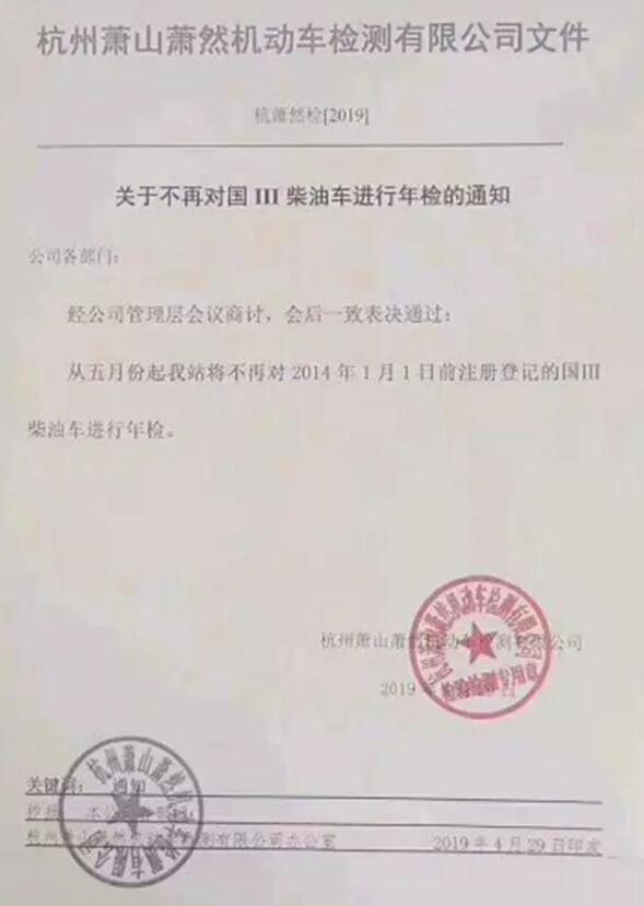從5月起,杭州蕭山蕭然機動車檢測站將不再對2014年1月1日前注冊登記的國三柴油車進行年檢!