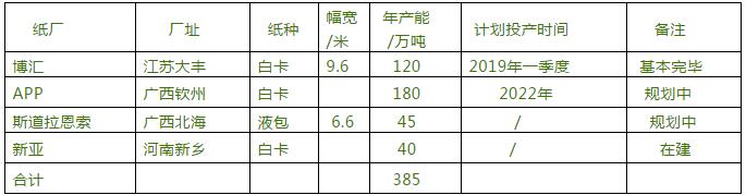 我國白卡紙主要產能大約1140萬噸,而APP金光集團、晨鳴集團、博匯、太陽四大主要廠家產能共計約875萬噸,占主要產能的77%左右。現在大型紙廠仍有新上產能的計劃,行業高度集中,寡頭特征明顯。 2、潛在產能 白卡紙潛在產能表