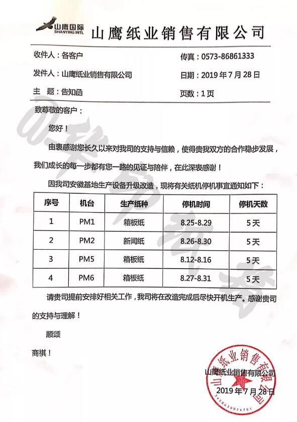 導語:7月28日,山鷹紙業發出停機函。函中稱安徽基地由于生產設備升級改造,故從8月12日起開始陸續停機。此次停機涉及4臺紙機,主要是箱板紙機,每臺紙機各停5天,總停機時長累計達20天!