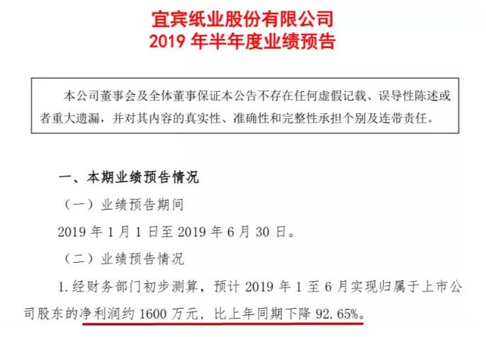 去年同期,理文造紙的凈利潤約為25.13億元人民幣,據此推測,今年上半年理文的凈利潤大概在14.3億元人民幣。 就在上個月,花旗發表研究報告,下調理文造紙于2019至2021年間盈利預測介于13%至21%,主要反映毛利率低于預期。 該行預計,今年理文造紙銷售量將倒退10%至250萬噸,每噸毛利倒退40%至600港元(約527元人民幣)。 而在理文發布盈利預警之后,大和證券也發表研究報告指,認為盈利下降乃意料之內。因其下游需求持續走軟和相關業務供應過多,促使平均售價下降,理文亦難以遠離行業疲軟的周期和潛在利潤下降。 宜賓紙業預計上半年凈利約1600萬元,比上年同期下降92.65% 實際上,早在理文前,宜賓紙業就已發布上半年盈利預期,凈利預降九成。